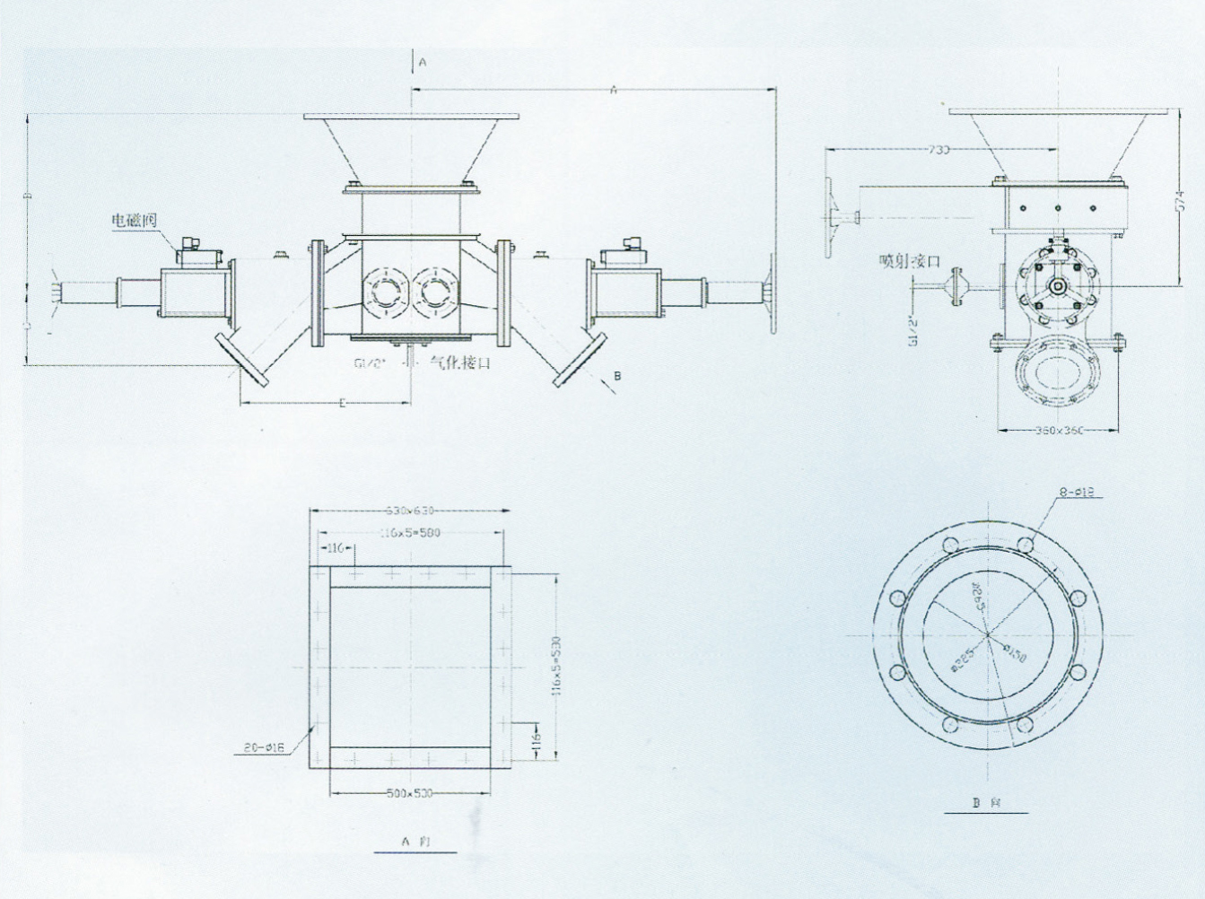 該設備用于粉料貯倉底部或側面卸料用,設備帶有流化裝置,卸料時能使物料流態(tài)化排出,通過輸送管道或斜槽,配合散裝機直接裝料,該系統(tǒng)有氣動和手動兩種控制方式,氣動用電磁閥控制氣缸伸縮運動,實現卸料閥門的啟閉;手動為轉動手輪啟閉閥門。