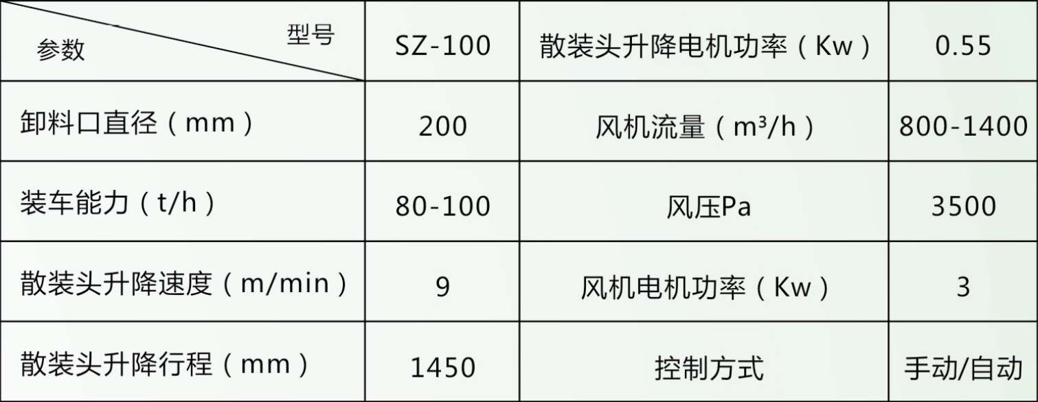 本設(shè)備是與卸料器,輸送斜槽,振動(dòng)料斗等給料設(shè)備配套的全自動(dòng)散料裝車、裝船設(shè)備,配有全自動(dòng)控制系統(tǒng),工作全程處于封閉狀態(tài),有效的防止粉塵外溢。