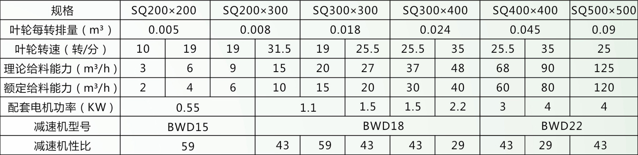 本產(chǎn)品在結(jié)構(gòu)上分為A型和B型,A型為針輪擺線減速配用鏈條傳動(dòng),其技術(shù)參數(shù)見表一;B型為直聯(lián)式傳動(dòng),技術(shù)參數(shù)見表二,產(chǎn)品規(guī)格以口徑劃分,每種規(guī)格均給出幾種給料能力供選擇,如有特殊要求,可代為設(shè)計(jì)制造。