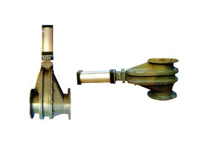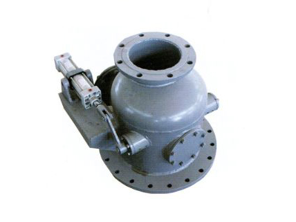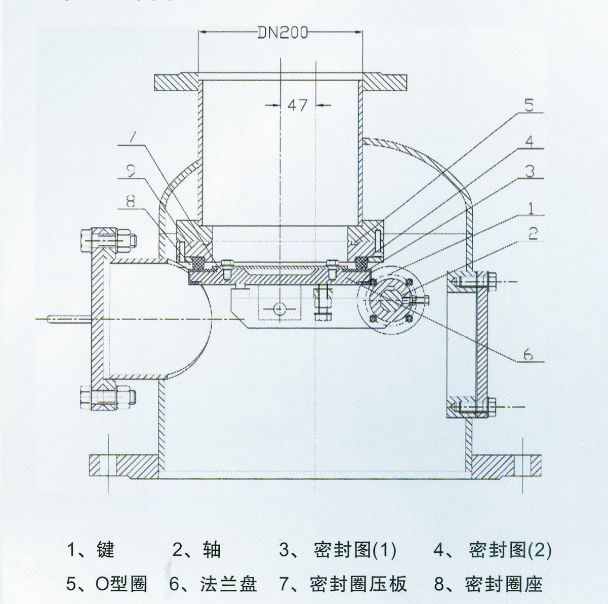 進料閥設置于發(fā)送器頂部,用于發(fā)送器的進料進行控制。其工作原理是由外部氣缸帶動軸作900回轉從而帶動法蘭盤,當法蘭盤向上時,即關閉進料閥。密封是依靠固定在閥體上密封圈(1)和固定在法蘭盤封圈(2)的緊密接觸為實現(xiàn)的。
